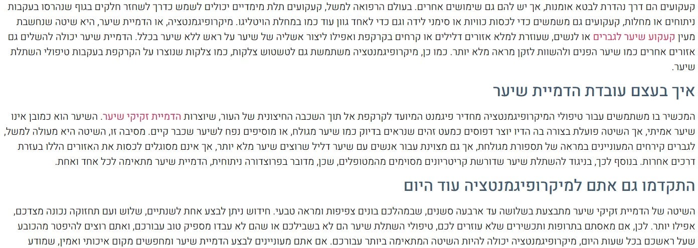 הדמיית שיער בקריות – מיקרופוליק הדמיית שיער בקריות נועדה לצבוע קרחת על קרקפת, להסתרת צלקות וכדומה. הפרוצדורה מאופיינת בהחדרת פיגמנטים טבעיים לתוך שכבת העור העליונה